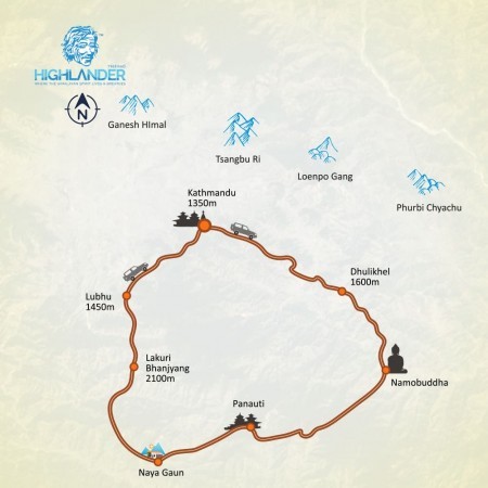 Heights: Kathmandu 1350 m, Dhulikhel 1600 m, Namobuddha 1900 mThank you for a perfect trek. It was a very good combination of culture, village and nature. A fantastic job by crew making us feel secure, comfortable and never hungry. We can only recommend.